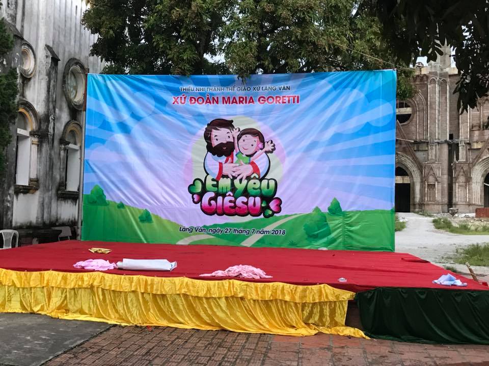 Chào các bạn, ngày hôm qua 27/7/2018, tại Giáo xứ Lãng Vân (Phát Diệm) đã tổ chức rất thành công Lễ Bổn Mạng Thiếu Nhi Thánh Thể & Sinh nhật Xứ đoàn lần thứ VII. Sự kiện kết thúc đã để lại không ít những ấn tượng tốt đẹp, đặc biệt là Logo và Phông sân khấu chính trong ngày lễ với chủ đề “Em yêu Giêsu”.