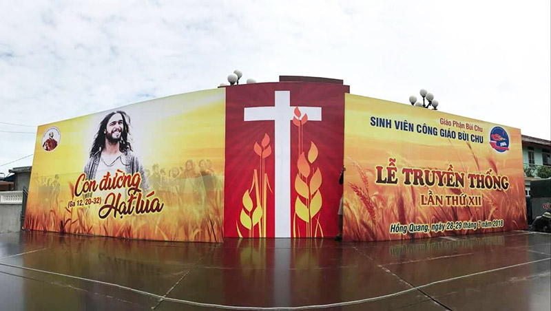 Chào các bạn, mấy hôm vừa rồi bận việc quá nên mình không viết bài thường xuyên được, rất mong các bạn thông cảm. Hôm nay mình viết bài giới thiệu mẫu thiết kế Phông sân khấu Lễ truyền thống SVCG Bùi Chu lần thứ XII được tổ chức tại Giáo xứ Hồng Quang, ngày 28-29/7 vừa qua.